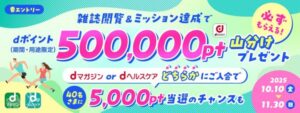 ![]() 出典:dマガジン | 雑誌閲覧&ミッション達成で 50万ポイント山分け プレゼントキャンペーン | 50万ポイントを 参加者で山分け | 雑誌閲覧& ミッション達成 | 2025年10月10日〜 2025年11月30日 |