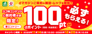 ![]() 出典:dマガジン | 【ズゴ得コンテンツ契約者限定】 dマガジン入会+閲覧で 100ポイントプレゼント | 全員に100ポイント | スゴ得コンテンツ、 dマガジンを契約し、 1冊20ぺージ以上閲覧 | 2025年11月14日〜 2025年12月25日 |