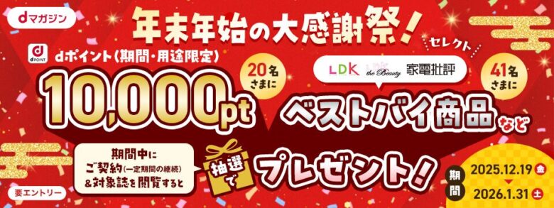 dマガジンでは、2025年12月19日(金)~2026年1月31日(土)の間で「10,000ポイント&ベストバイ商品プレゼントキャンペーン」を実施しています。キャンペーン詳細は以下の通りです。
