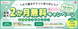 ![]() 出典:dマガジン | 実質最大2か月無料 キャンペーン(再入会もOK) | 全員に最大980ポイント | ①キャンペーン期間中にエントリーされた方 ②キャンペーン期間中にdマガジンにご入会された方 (再入会の方も対象です) ③2026年6月1日まで契約を継続している方 | 2026年2月18日~ 2026年3月31日 |