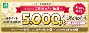 ![]() 出典:dマガジン | dカード会員限定! dマガジン契約(再入会もOK)で 5000ポイントプレゼント | 5000ポイント×10名 | dカードに入会中の方がdマガジンに 契約(再入会もOK)し、1冊以上閲覧 | 2026年2月2日〜 2026年2月28日 |