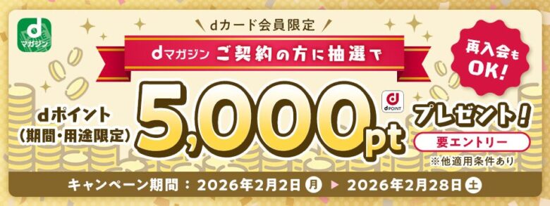 dカード会員限定!dマガジン契約(再入会もOK)で5000ポイントプレゼントキャンペーン5000ポイント×10名2026年2月2日〜2026年2月28日dカードに入会中の方がdマガジンに契約(再入会もOK)し、1冊以上閲覧