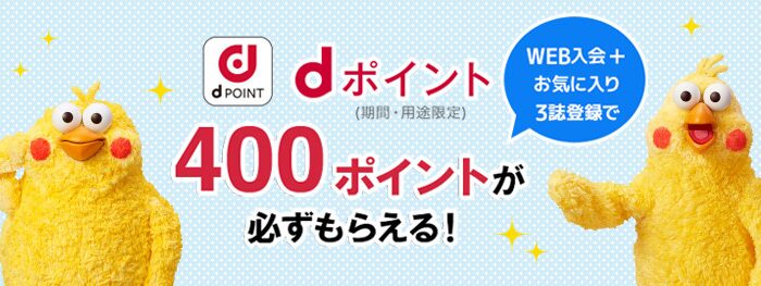 400ポイントWeb入会キャンペーン合計400ポイント(300ポイント+100ポイント)継続中・終了日未定ドコモオンライン手続き+「お気に入り登録」を3誌以上する