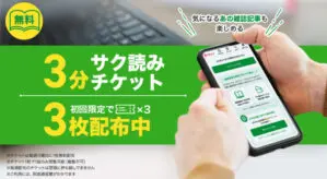 ![]() 出典:dマガジン | 3分サク読みチケット ×3枚配布キャンペーン | 3分サク読みチケット×3枚配布 (期間・用途限定) | dアカウントでログインされた方 | ~2026年3月31日 |