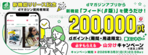 ![]() 出典:dマガジン | 新機能「フィード版」を使うだけ! 20万ポイント山分けキャンペーン | 20万ポイントを応募者数で山分け | ①キャンペーン期間中にエントリーした方 ②dマガジンを既にご契約されている方 ③キャンペーン期間中にフィード(β版)内の項目を 一つ以上フォローし、かつ5記事以上を閲覧された方 ④2026年5月1日までdマガジンの契約を継続されている方 | 2026年3月2日~ 2026年3月31日 |