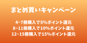 出典:kindle unlimited | Kindle本(電子書籍) まとめ買いキャンペーン | 4~7冊購入で5%ポイント還元 /8~11冊購入で10%ポイント還元 /12冊購入で12%ポイント還元 | 一週間ごとにまとめ買いカートが更新されます。 各週のキャンペーンにそれぞれエントリーすることで、 お客様は最大2回、キャンペーンに参加できます。 | 2025年9月12日 ~2025年9月19日 |