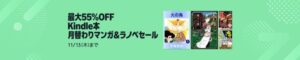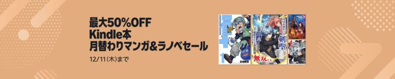 kindle unlimitedでは、2025年12月5日(金)~2025年12月11日(木)の間で、「最大50%OFF Kindle本(電子書籍)月替わりマンガ&ラノベセール」を実施しています。