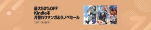 ![]() 出典:kindle unlimited | 【最大50%OFF】Kindle本(電子書籍) 月替わりマンガ&ラノベセール | kindle本(電子書籍)の マンガとラノベが最大50%OFF | 本キャンペーンページに 表示されている対象本を購入 | 2025年12月5日 ~2025年12月11日 |