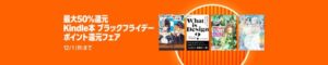 | Kindle本(電子書籍)50%還元ポイントキャンペーン | kindle本(電子書籍)購入価格から50%ポイント還元 | 2025年12月2日~2025年12月15日 | kindle本(電子書籍)を購入するお客様(プラン未加入でも可) |