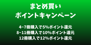 出典:kindle unlimited | Kindle本(電子書籍) まとめ買いキャンペーン | 4~7冊購入で5%ポイント還元 /8~11冊購入で10%ポイント還元 /12冊購入で12%ポイント還元 | 一週間ごとにまとめ買いカートが更新されます。 各週のキャンペーンにそれぞれエントリーすることで、 お客様は最大2回、キャンペーンに参加できます。 | 2025年9月12日 ~2025年9月19日 |