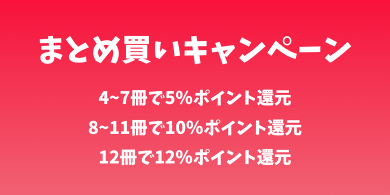 | Kindle本(電子書籍) まとめ買いキャンペーン | 4~7冊購入で5%ポイント還元/8~11冊購入で10%ポイント還元/12冊購入で12%ポイント還元 | 2026年4月17日~2026年5月7日 | kindle本(電子書籍)を購入するお客様(プラン未加入でも可) |