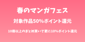 ![]() | 春のマンガフェス! 対象作品50%ポイント還元! 10冊以上のまとめ買いで さらに10%ポイント 還元キャンペーン | 対象作品50%ポイント還元 +10冊購入で10%ポイント還元 | ①キャンペーン期間内に対象作品を 購入すると50%ポイント還元 ②さらにキャンペーン期間内に対象商品を 10冊購入するとエントリー後に購入した 最初の10冊に限りポイント付与 | 2025年3月31日 ~2025年4月4日 |