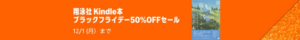 ![]() 出典:kindle unlimited | 【最大50%還元】Kindle本 ブラックフライデー ポイント還元フェア | kindle本(電子書籍) 購入価格から最大50% ポイント還元 | 本キャンペーンページに 表示されている対象本を購入 | 2025年11月24日 ~2025年12月1日 |