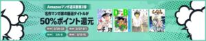 ![]() 出典:kindle unlimited | 最近人気の マンガシリーズ全巻 50%ポイント還元 | kindle本(電子書籍) マンガ購入価格の 50%ポイント還元 | 本キャンペーンページに 表示されている対象本を購入 | 2025年9月12日 〜2025年9月14日 |