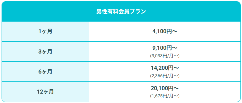 | 男性月額料金(アプリ) | 4,900円〜 |