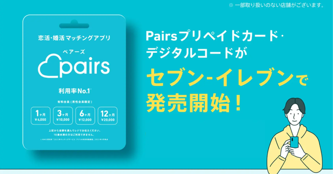 店内のプリペイドカードコーナーでPairsのカードを探し、レジで支払います。4,000円分などの券種があり、これが実質的なペアーズの有料会員の料金となります。 - スマホプリペイド