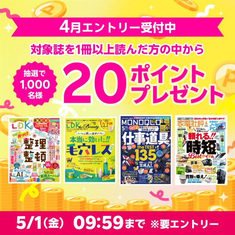 ![]() 出典:楽天マガジン | 「MONOQLO the Best」を 読んだ方の中から抽選で50ポイント 対象店舗にて3,000円以上 購入した方の中から抽選で 500ポイントプレゼントキャンペーン | ①1000名×50ポイント ②1000名×500ポイント | ①対象雑誌を読めば抽選で50ポイント贈呈 ②更に楽天市場対象店舗にて 税込3,000円以上購入すれば 抽選で500ポイント贈呈 | 2025年4月21日~ 2025年6月4日 |