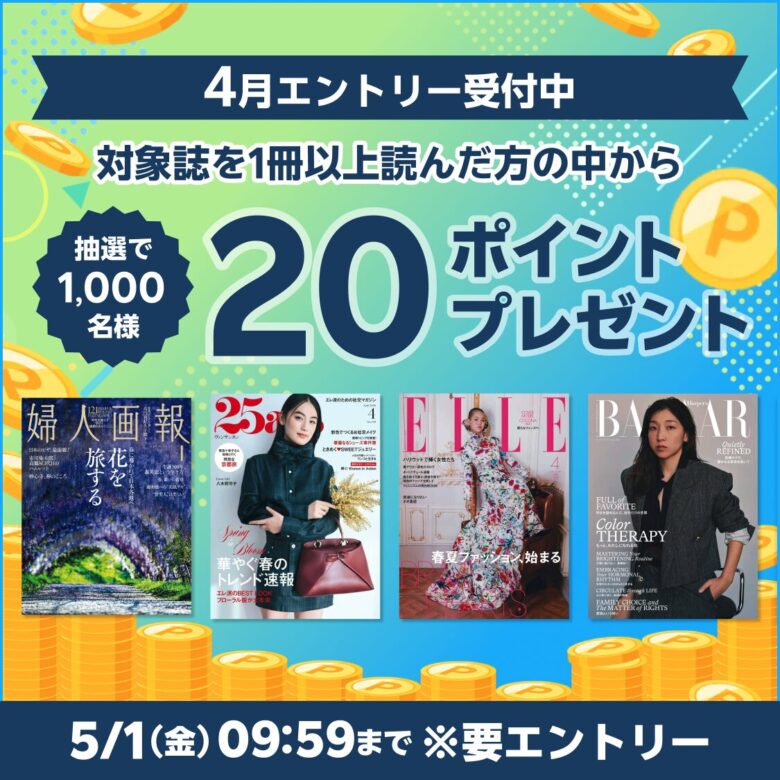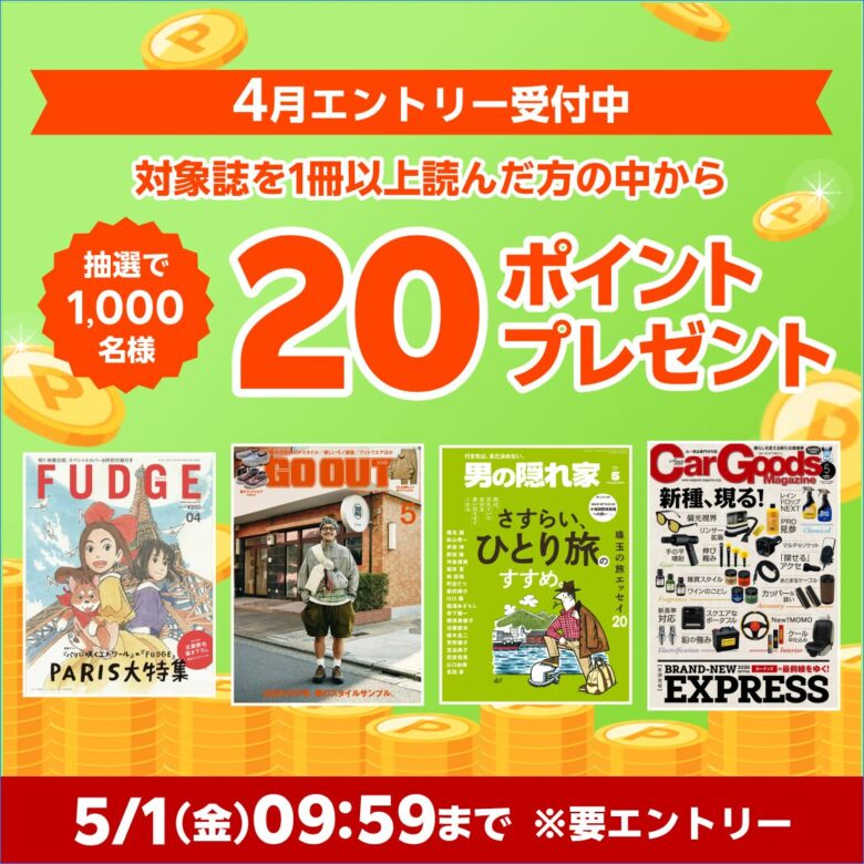対象雑誌を読んだ方の中から抽選で50ポイント・対象店舗にて3,000円以上購入した方の中から抽選で500ポイントプレゼント - 期間:2026年4月1日~2026年6月11日