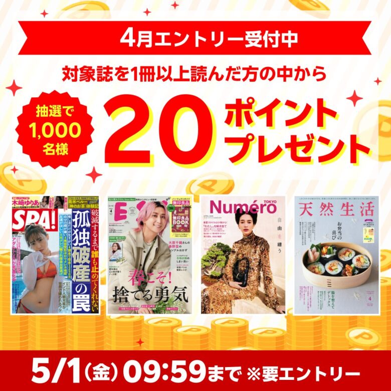 | 対象雑誌を読んだ方の中から抽選で50ポイント・対象店舗にて3,000円以上購入した方の中から抽選で500ポイントプレゼント | 50ポイント×1000名 500ポイント×1000名 | 2026年3月2日~2026年5月7日 | 月額プラン・年額プランの両方 |