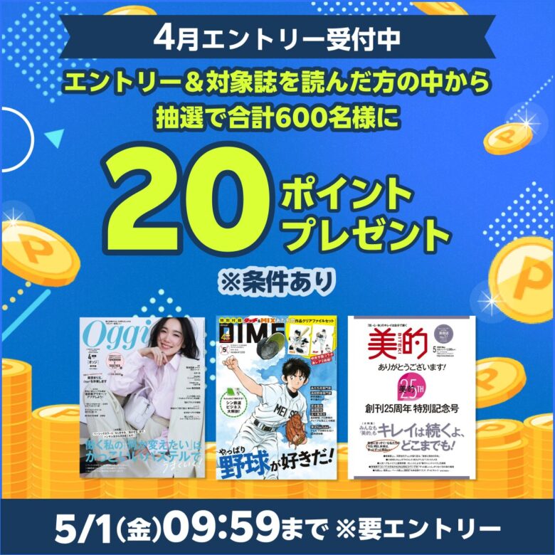 このキャンペーンは、2026年4月1日(水)~2026年5月1日(金)の期間中で「対象作品を読んだ人の中から抽選で20ポイントプレゼント」キャンペーンを実施しています。