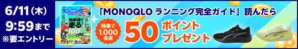 「MONOQLO ランニング完全ガイド」を読んだ方の中から抽選で50ポイント・対象店舗にて3,000円以上購入した方の中から抽選で500ポイントプレゼント