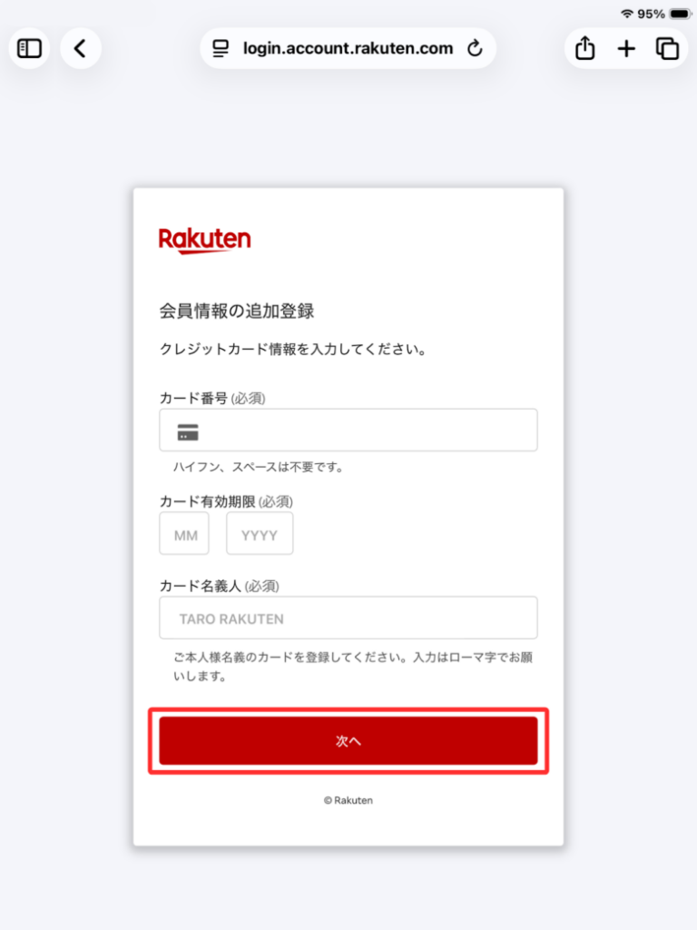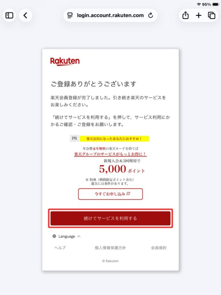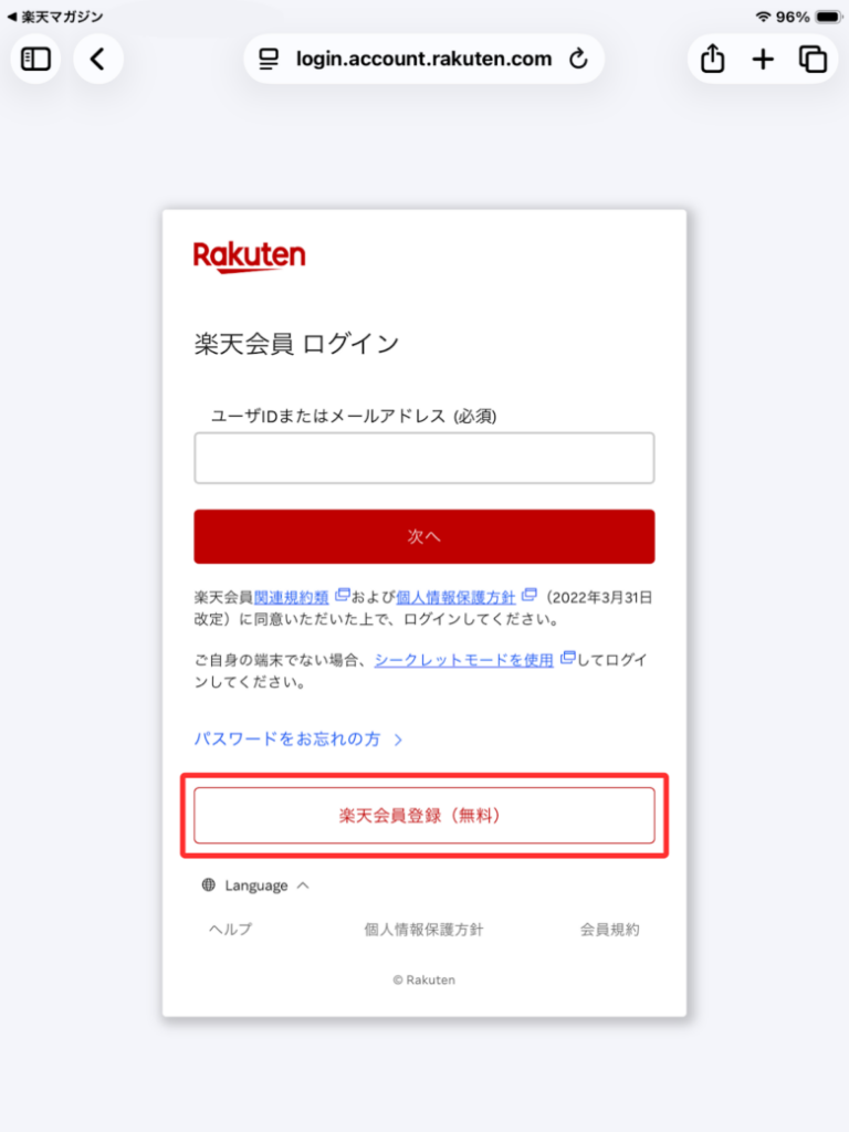 楽天会員でない方は、楽天会員ログインページの下部にある「楽天会員に新規登録(無料)してサービスを利用する」のボタンを選択してください。楽天会員の登録後、次のステップへ進みましょう。
