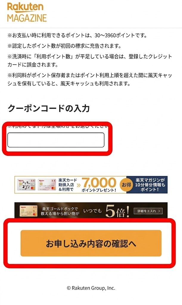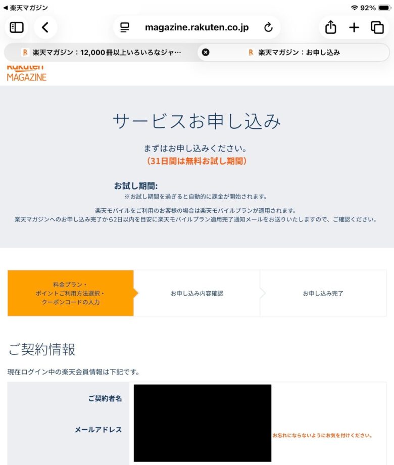 最下部には、「楽天マガジンに申し込む」のボタンが表示されています。問題なければ、こちらをクリックしましょう。