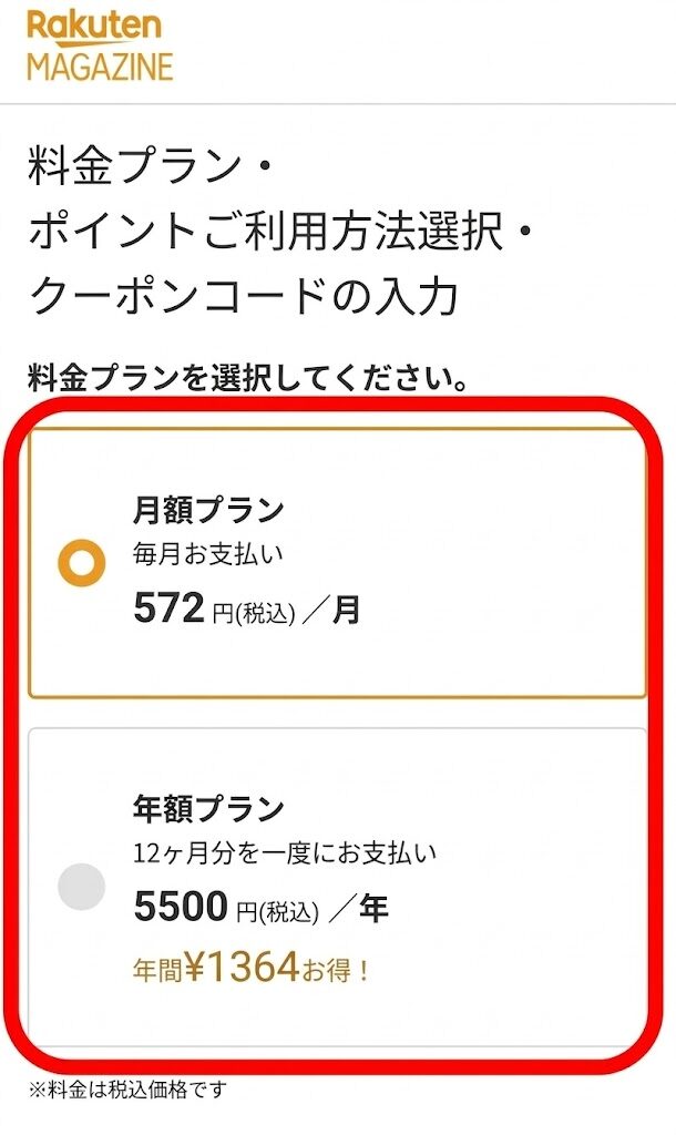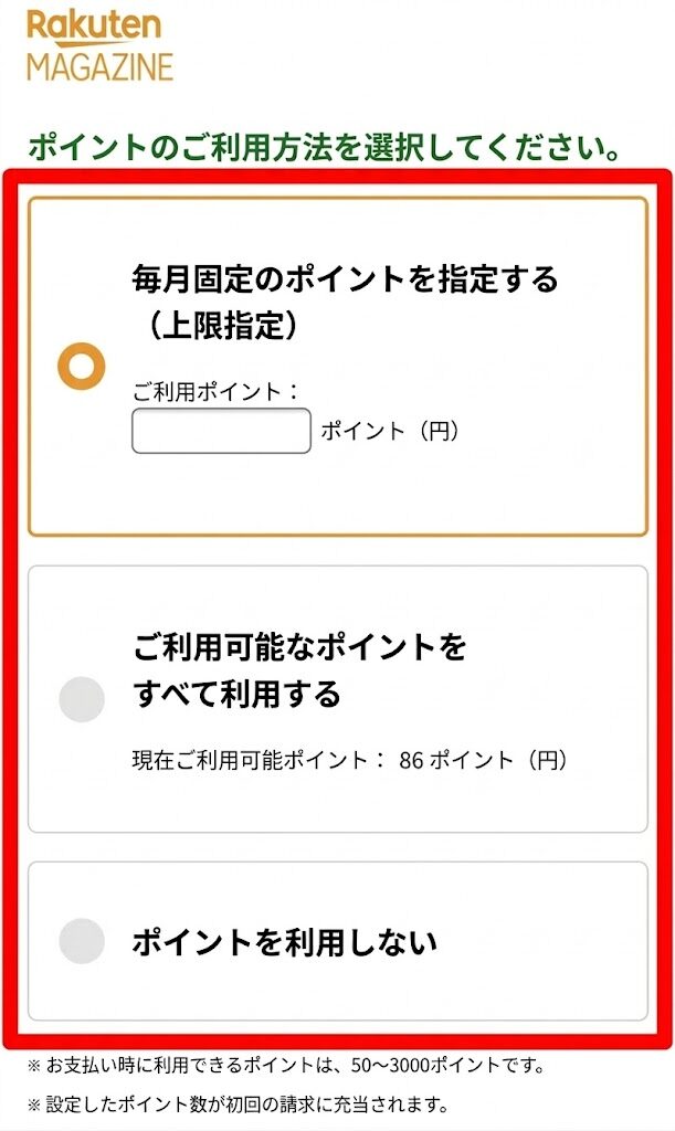 5.料金プランの選択後、下へスクロールすると、「ポイントのご利用方法を選択してください。」の案内が出てきます。ここで設定を行えば、楽天マガジンの毎月の支払いへ、ふだん貯めている楽天ポイントを充てられるようになります。