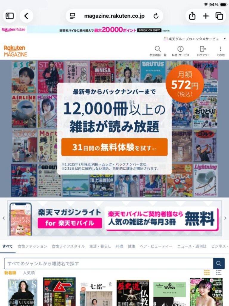 楽天マガジンは、「登録が簡単」かつ「使いやすい」ことが大きなメリット。登録をいち早く済ませて、ラインナップされている雑誌を片っ端から読み倒しましょう。